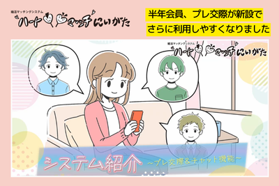 婚活マッチングシステム「“ハート マッチ”にいがた」とは、「まだ知らない二人の心をめぐり会わせる!」という想いを込めて、新潟県と「にいがた婚活応援大使」の横澤夏子さんが決めた愛称です。