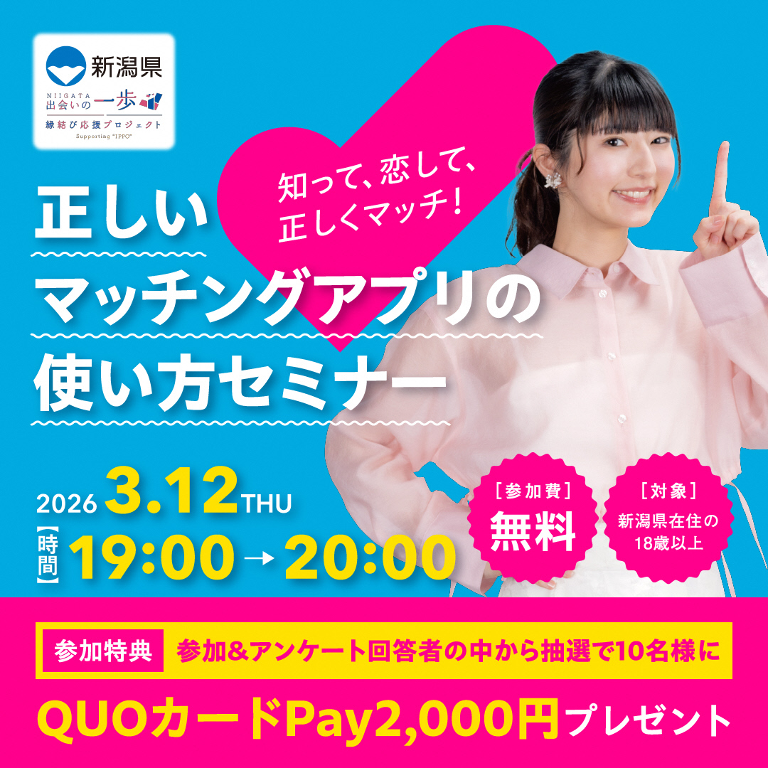 婚活マッチングシステム「“ハート マッチ”にいがた」とは、「まだ知らない二人の心をめぐり会わせる!」という想いを込めて、新潟県と「にいがた婚活応援大使」の横澤夏子さんが決めた愛称です。