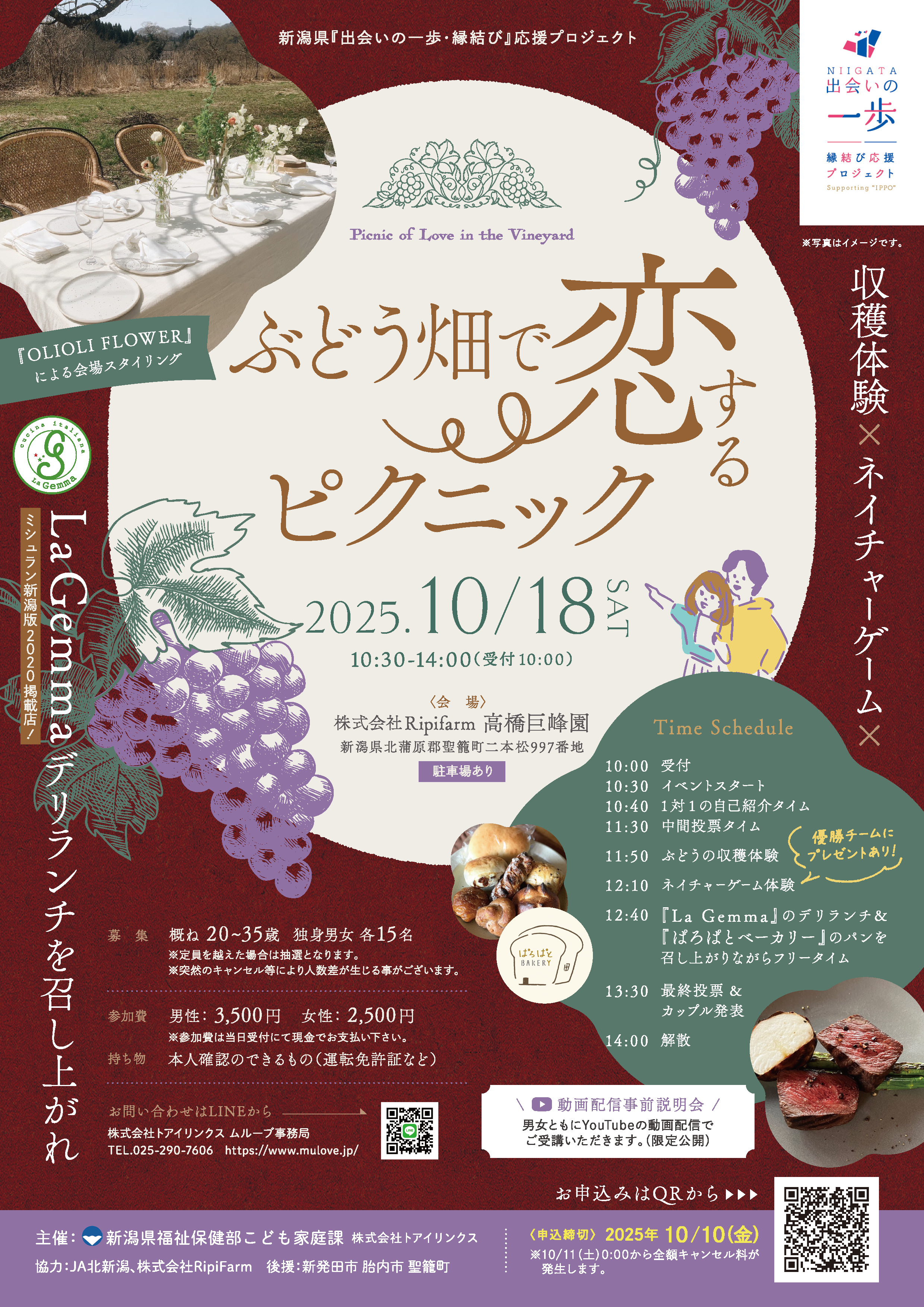 ぶどう畑で恋するピクニック-収穫体験×ネイチャーゲーム×LaGennmaデリランチを召し上がれ- -
