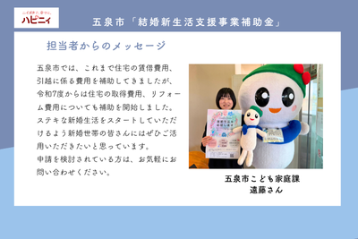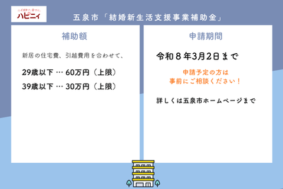 五泉市では、これまで住宅の賃借費用、引越に係る費用を補助してきましたが、令和7度からは住宅の取得費用、リフォーム費用についても補助を開始しました。ステキな新婚生活をスタートしていただけるよう新婚世帯の皆さんにはぜひご活用いただきたいと思っています。