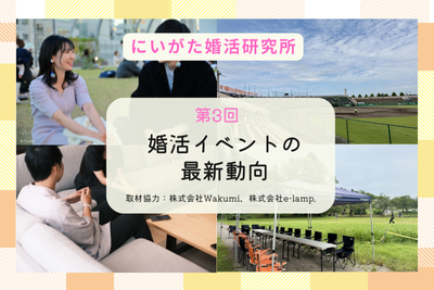 「にいがた婚活研究所」では、新潟県で利用できる3つの代表的な婚活サービスを紹介しています。前回の街コンに続き、「婚活イベント」に注目。そもそもどんな場なのか、特徴や最新アイテムまで、気になるポイントを探ります。新潟県が主催する「出会いの一歩・縁結び」応援プロジェクトで、婚活イベントの企画・運営に携わる株式会社Wakumi代表の椎名さんと、株式会社e-lamp.代表の山本さんにお話を聞きました。
