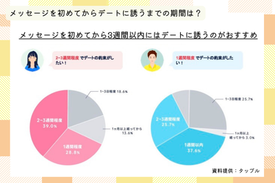 タップルのアンケートによると、メッセージを始めてから女性は「2〜3週間程度」、男性は「1週間程度」でデートの約束をしたいと感じている人が最も多いです。