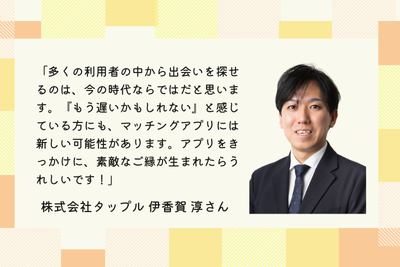 「多くの利用者の中から出会いを探せるのは、今の時代ならではだと思います。『もう遅いかもしれない』と感じている方にも、マッチングアプリには新しい可能性があります。アプリをきっかけに、素敵なご縁が生まれたらうれしいです!」