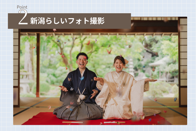 「結婚式を挙げず、フォトウェディングを選ぶカップルも増えています。新潟の魅力を活かしたロケーション撮影も人気で、江南区の北方文化博物館や田上町の椿寿荘、サンセットの海、公園、商店街など、衣装や思い出に合った場所で“新潟らしい写真”を残す方が多いです」