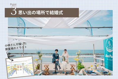「新潟の海辺で、白シャツ+デニムをドレスコードにしたビーチウェディングを手がけました。後日“夢に出てきたほど忘れられない結婚式”と言っていただけたのは、私にとっても大きな喜びでした」