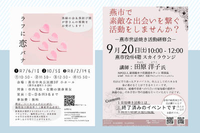 「ラフに恋バナ相談会」のほか、結婚応援団「燕縁の会」(ボランティア)が結婚を希望される方のサポートを行っているほか、燕市結婚支援ボランティア「燕結び隊」の養成・募集を開始し、身近な方への情報提供や引き合わせなど、草の根の支援力を高めています。